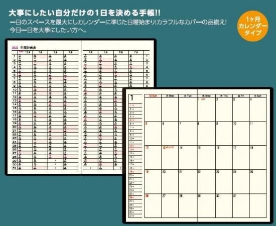 一日のスペースを最大にしカレンダーに準じた日曜始まり!カラフルなカバーの品揃え!